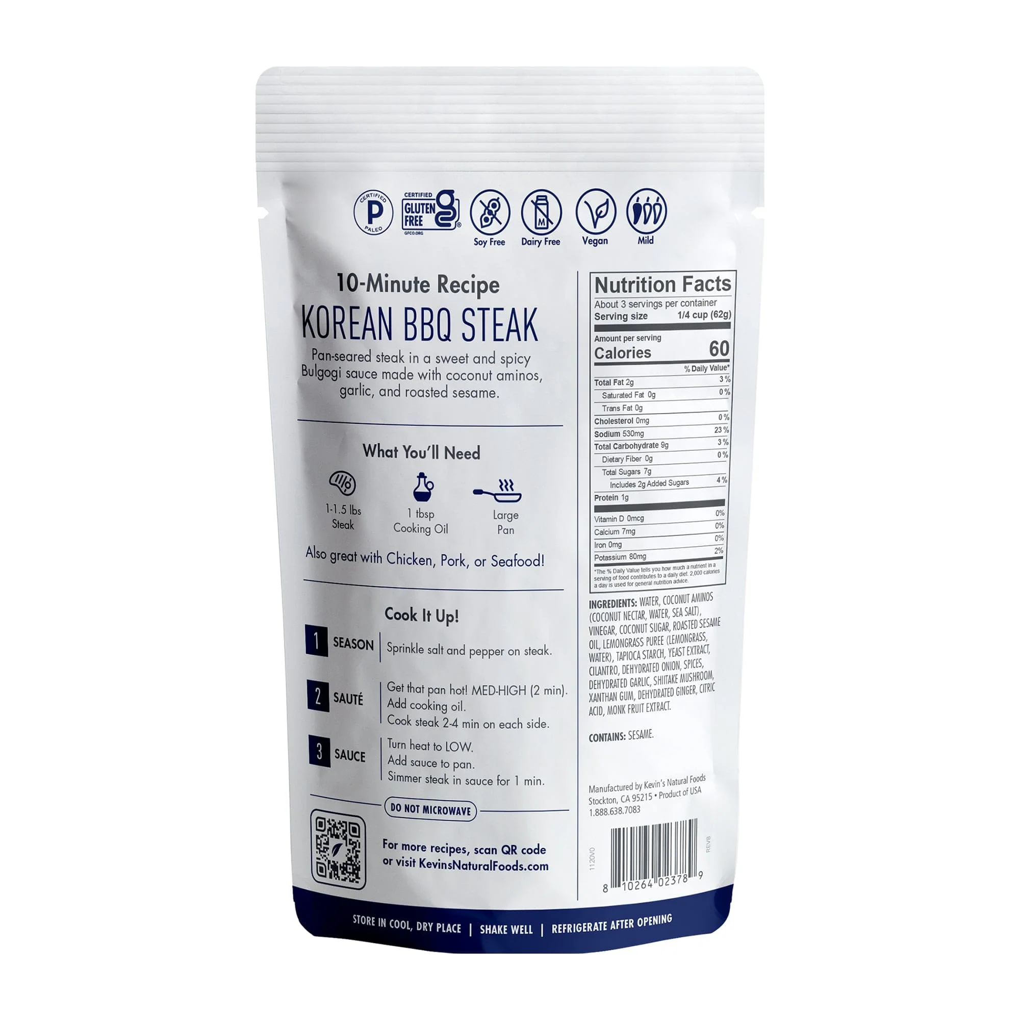 A sweet and spicy Bulgogi sauce made with coconut aminos, garlic, and toasted sesame seeds. What's "Bulgogi" you ask? It literally means "fire meat", and can take your steak, chicken, or pork up to the next level.
